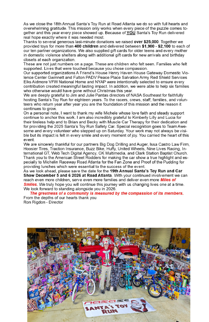 Please help us help these organization in December 2026 with the 19th annual Santa’s Toy Run. Sponsorships and donations needed. These organization counts on our support to help provide toys for kids at Christmas and without our continued support, many children would not have any gifts for Christmas. Help Circle Heart Racing continue to bring, “Miles of Smiles”